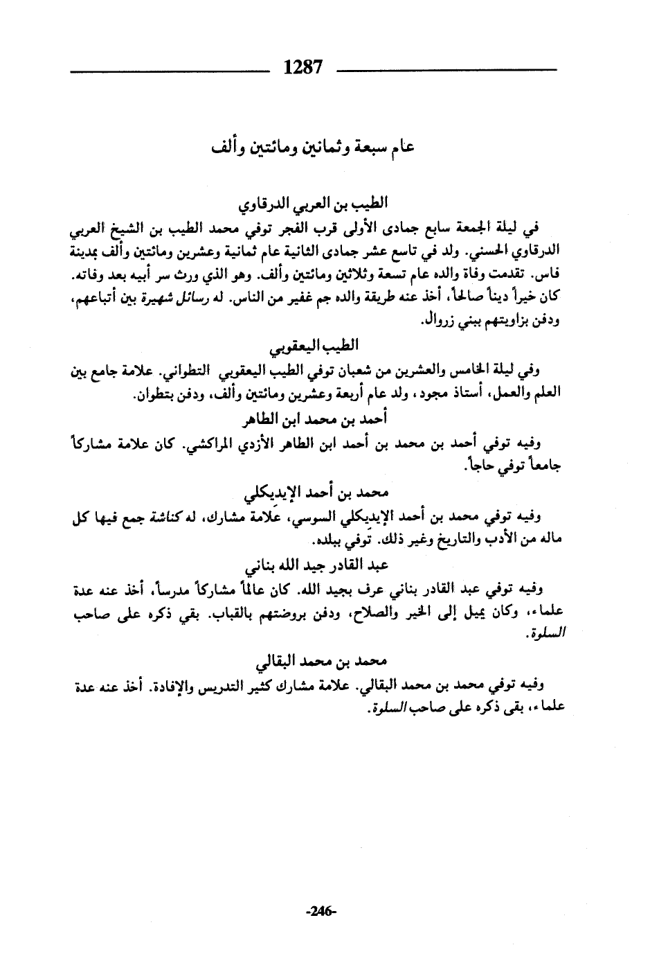 وفيه توفي عبد القادر بناني عرف بجيد الله. كان عالما مشاركا مدرسا، أخذ عنه عدة علماء، وكان يميل إلى الخير والصلاح، ودفن بروضتهم بالقباب. بقي ذكره على صاحب السلوة.