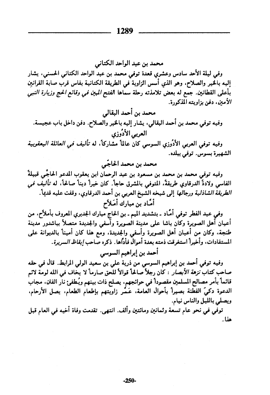 وفي ليلة الأحد سادس وعشري قعدة توفي محمد بن عبد الواحد الكتاني الحسني، يشار إليه بالخير والصلاح، وهو الذي أسس الزاوية في الطريقة الكتانية بفاس قرب صابة القرانين بأعلى القطانين. جمع له بعض تلامذته رحلة سماها الفتح المبين في وقائع الحج وزيارة النبي الأمين، دفن بزاويته المذكورة.