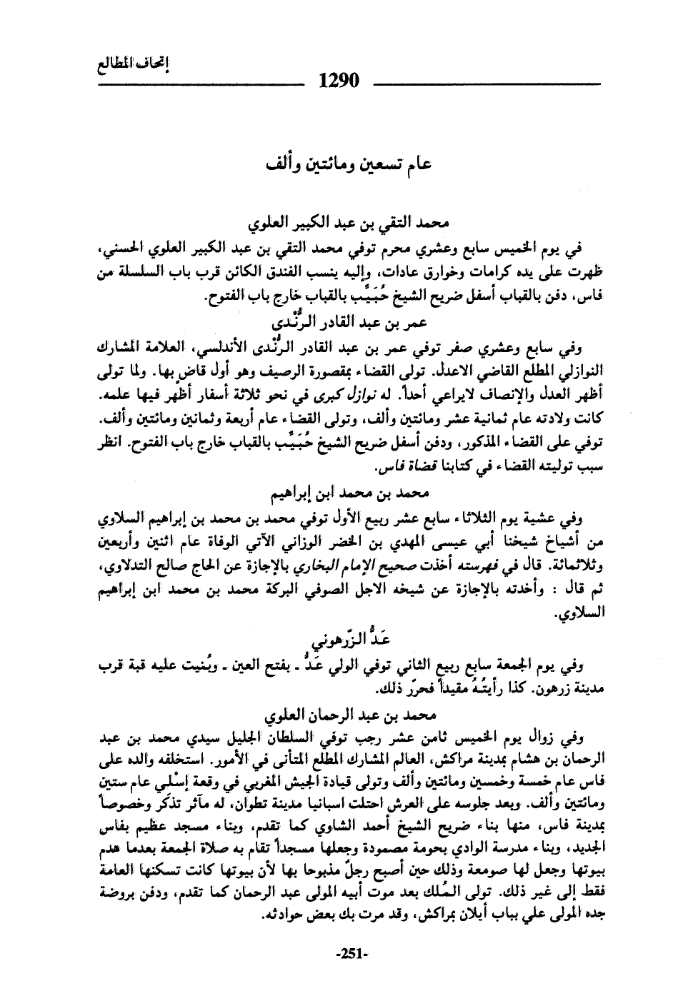 وفي زوال يوم الخميس ثامن عشر رجب توفي السلطان الجليل سيدي محمد بن عبد الرحمان بن هشام بمدينة مراكش، العالم المشارك المطلع المتأنى في الأمور. استخلفه والده على فاس عام خمسة وخمسين ومائتين وألف وتولى قيادة الجيش المغربي في وقعة إسلي عام ستين ومائتين وألف. وبعد جلوسه على العرش احتلت اسبانيا مدينة تطوان، له مآثر تذكر وخصوصا بمدينة فاس، منها بناء ضريح الشيخ أحمد الشاوي كما تقدم، وبناء مسجد عظيم بفاس الجديد، وبناء مدرسة الوادي بحومة مصمودة وجعلها مسجدا تقام به صلاة الجمعة بعد ما هدم بيوتها وجعل لها صومعة وذلك حين أصبح رجل مذبوحا بها لأن بيوتها كانت تسكنها العامة فقط إلى غير ذلك. تولى الملك بعد موت أبيه المولى عبد الرحمان كما تقدم، ودفن بروضة جده المولى علي بباب أيلان بمراكش، وقد مرت بك بعض حوادثه.