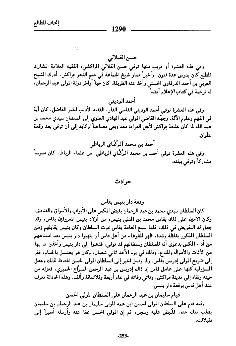 وفي هذه العشرة أو قريب منها توفي حسن الفلالي المراكشي، الفقيه العلامة المشارك المطلع كان يدرس عدة فنون، وأخيرا صار شيخ الجماعة في علم النحو بمراكش. أدرك الشيخ العربي بن أحمد الدرقاوي الحسني وأخذ عنه الطريقة. كان حيا أواخر دولة المولى عبد الرحمان، له ترجمة في كتاب الإعلام أيضا.