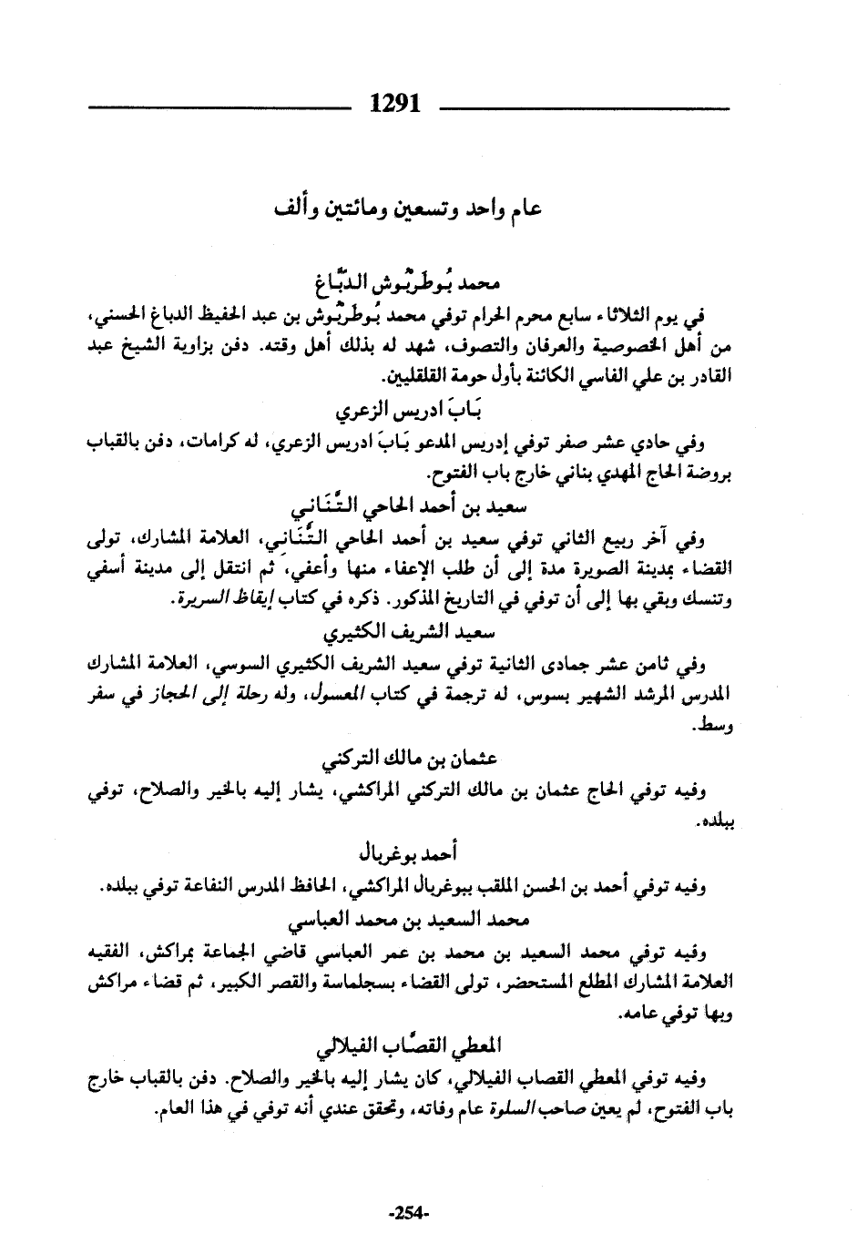 وفيه توفي محمد السعيد بن محمد بن عمر العباسي قاضي الجماعة بمراكش، الفقيه العلامة المشارك المطلع المستحضر، تولى القضاء بسجلماسة والقصر الكبير، ثم قضاء مراكش وبها توفي عامه.