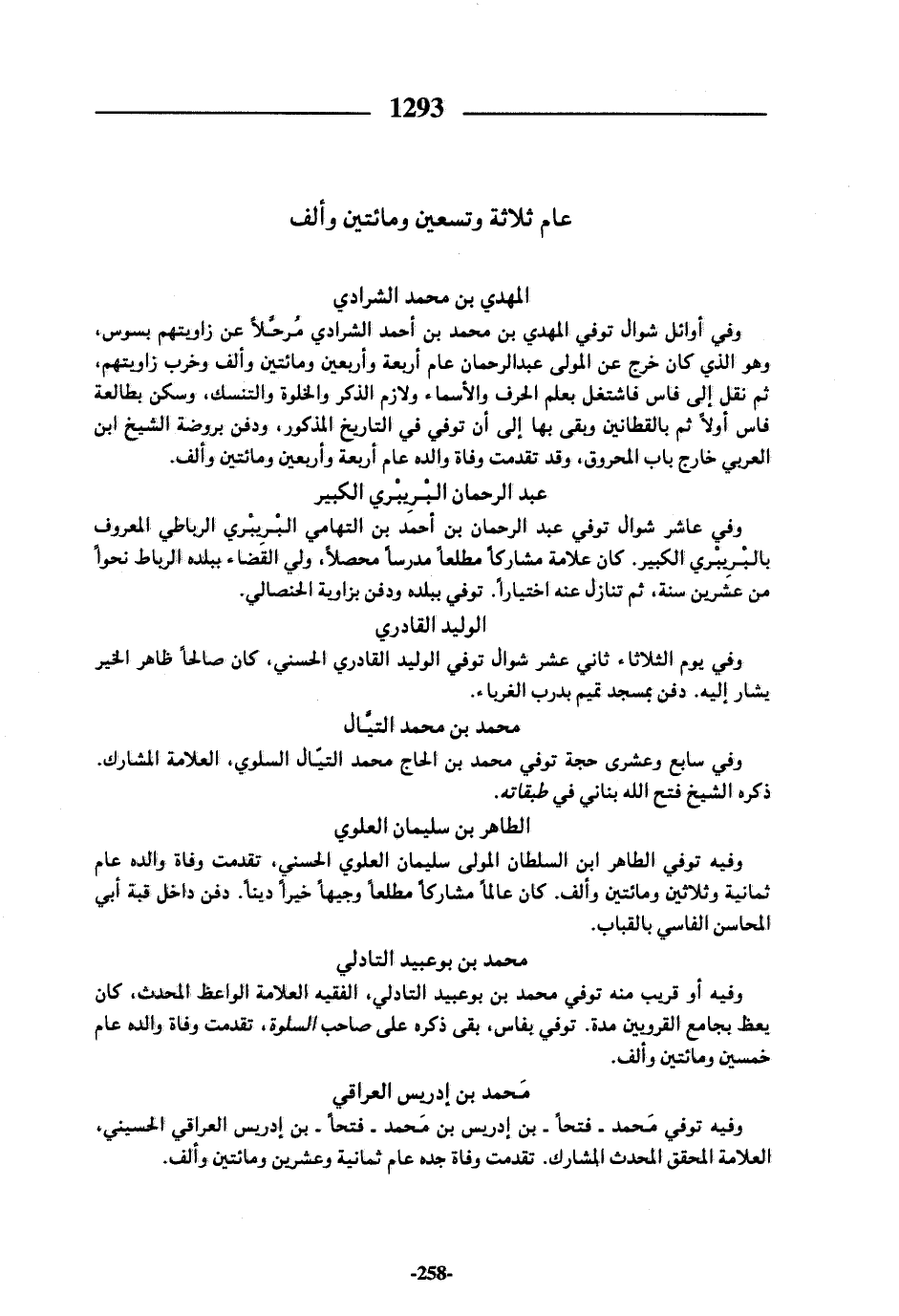وفيه توفي الطاهر ابن السلطان المولى سليمان العلوي الحسني، تقدمت وفاة والده عام ثمانية وثلاثين ومائتين وألف. كان عالما مشاركا مطلعا وجيها خيرا دينا. دفن داخل قبة أبي المحاسن الفاسي بالقباب.