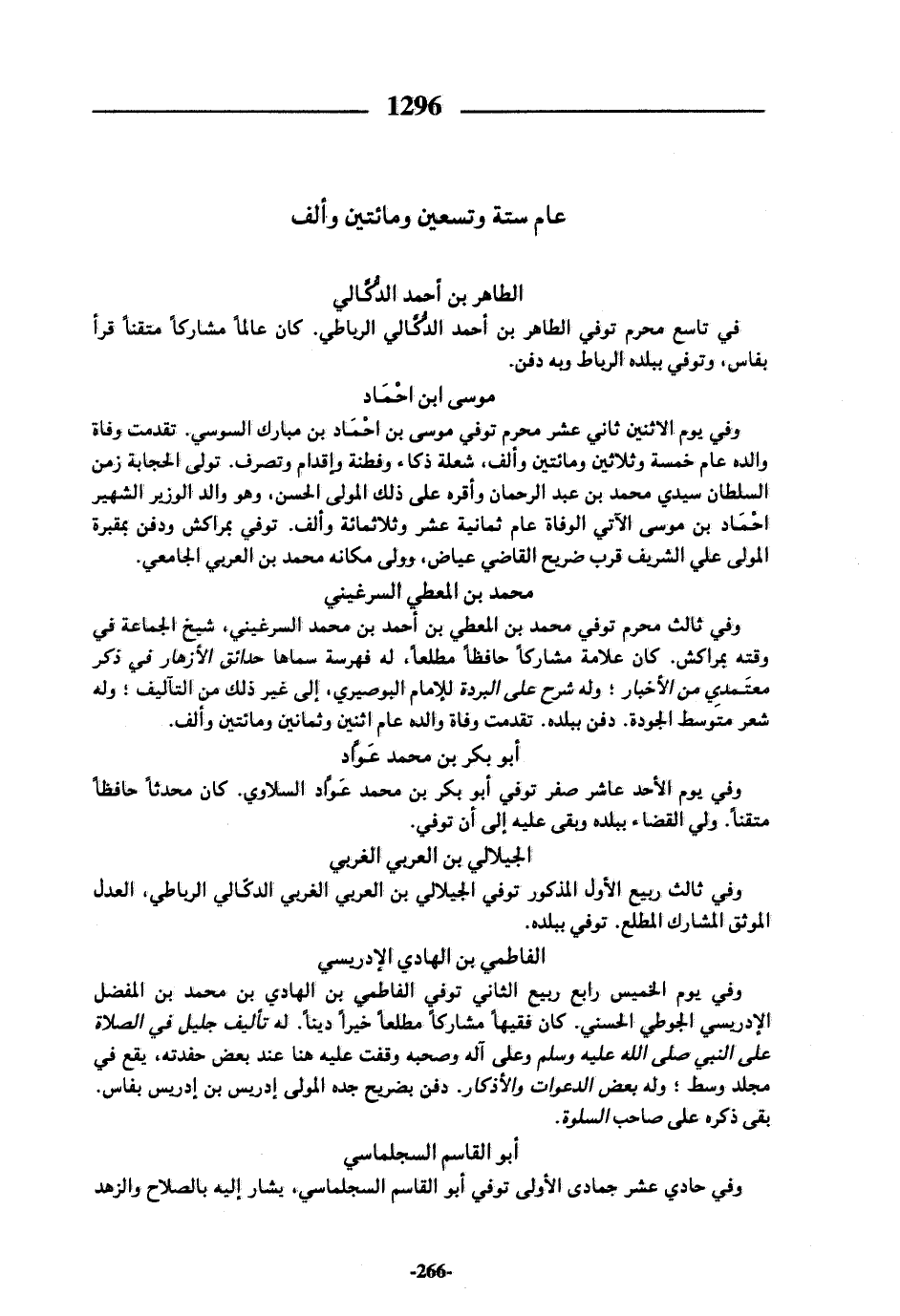 وفي يوم الاثنين ثاني عشر محرم توفي موسى بن احماد بن مبارك السوسي. تقدمت وفاة والده عام خمسة وثلاثين ومائتين وألف، شعلة ذكاء وفطنة وإقدام وتصرف. تولى الحجابة زمن السلطان سيدي محمد بن عبد الرحمان وأقره على ذلك المولى الحسن، وهو والد الوزير الشهير احماد بن موسى الآتي الوفاة عام ثمانية عشر وثلاثمائة وألف. توفي بمراكش ودفن بمقبرة المولى علي الشريف قرب ضريح القاضي عياض، وولى مكانه محمد بن العربي الجامعي.