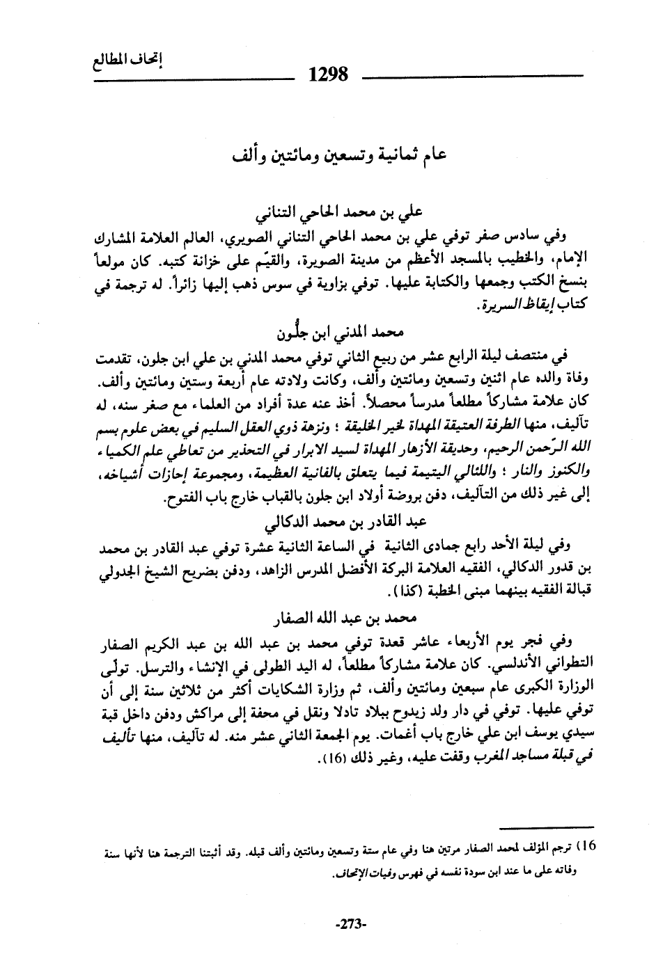 (¬16) ترجم المؤلف لمحمد الصفار مرتين هنا وفي عام ستة وتسعين ومائتين وألف قبله. وقد أثبتنا الترجمة هنا لأنها سنة وفاته على ما عند ابن سودة نفسه في فهرس وفيات الإتحاف.
