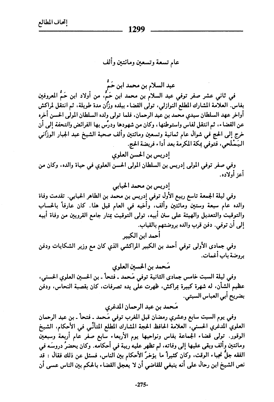 في ثاني عشر صفر توفي عبد السلام بن محمد ابن حمّ، من أولاد ابن حمّ المعروفين بفاس. العلامة المشارك المطلع النوازلي، تولى القضاء ببلده وزّان مدة طويلة، ثم انتقل لمراكش أواخر عهد السلطان سيدي محمد بن عبد الرحمان، فلما تولى ولده السلطان المولى الحسن أخره عن القضاء، ثم انتقل لفاس واستوطنها، وكان من شهودها ودرّس بها الفرائض والتحفة إلى أن خرج إلى الحج في شوال عام ثمانية وتسعين ومائتين وألف صحبة الشيخ عبد الجبار الوزّاني اليملحي، فتوفي بمكة المكرمة بعد أداء فريضة الحج.