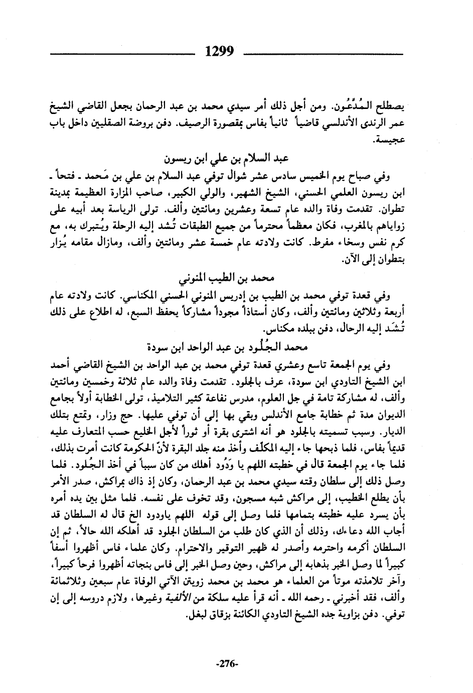 وفي صباح يوم الخميس سادس عشر شوال توفي عبد السلام بن علي بن محمد-فتحا- ابن ريسون العلمي الحسني، الشيخ الشهير، والولي الكبير، صاحب المزارة العظيمة بمدينة تطوان. تقدمت وفاة والده عام تسعة وعشرين ومائتين وألف. تولى الرياسة بعد أبيه على زواياهم بالمغرب، فكان معظما محترما من جميع الطبقات تشد إليه الرحلة ويتبرك به، مع كرم نفس وسخاء مفرط. كانت ولادته عام خمسة عشر ومائتين وألف، ومازال مقامه يزار بتطوان إلى الآن.