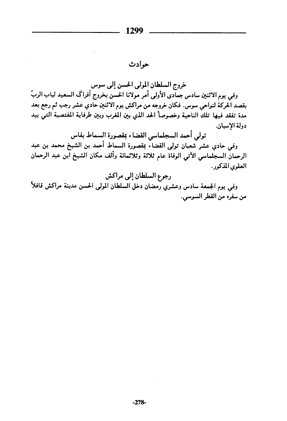 وفي يوم الجمعة سادس وعشري رمضان دخل السلطان المولى الحسن مدينة مراكش قافلا من سفره من القطر السوسي.