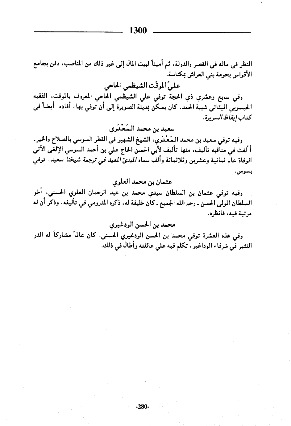 وفي هذه العشرة توفي محمد بن الحسن الودغيري الحسني. كان عالما مشاركا له الدر النثير في شرفاء الوداغير، تكلم فيه علي عائلته وأطال في ذلك.