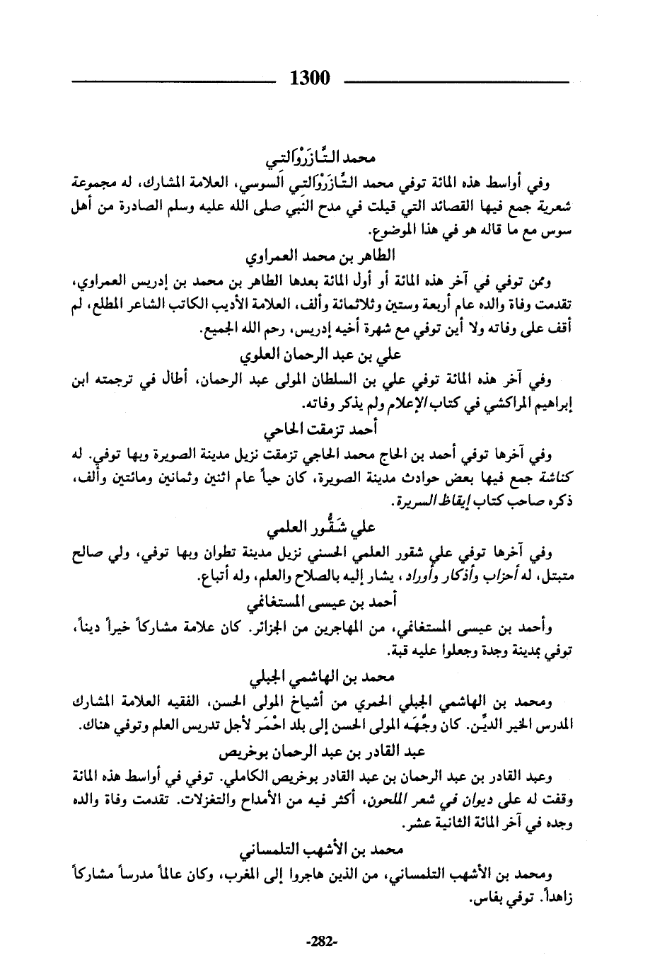 وفي أواسط هذه المائة توفي محمد التّازروالتي السوسي، العلامة المشارك، له مجموعة شعرية جمع فيها القصائد التي قيلت في مدح النبي صلى الله عليه وسلم الصادرة من أهل سوس مع ما قاله هو في هذا الموضوع.