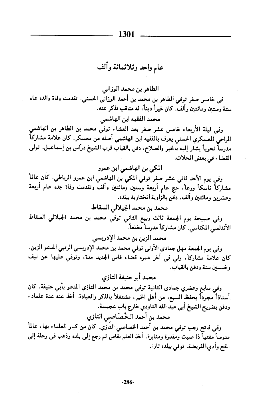 وفي سابع وعشري جمادى الثانية توفي محمد بن محمد التازي المدعو بأبي حنيفة. كان أستاذا مجودا يحفظ السبع، من أهل الخير، مشتغلا بالذكر والعبادة. أخذ عنه عدة علمادء ودفن بضريح الشيخ أبي عبد الله التاودي خارج باب عجيسة.