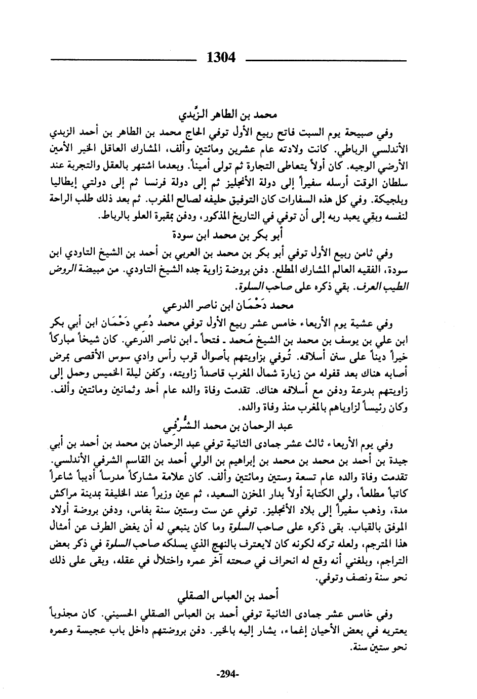وفي صبيحة يوم السبت فاتح ربيع الأول توفي الحاج محمد بن الطاهر بن أحمد الزبدي الأندلسي الرباطي. كانت ولادته عام عشرين ومائتين وألف، المشارك العاقل الخير الأمين الأرضي الوجيه. كان أولا يتعاطى التجارة ثم تولى أمينا. وبعد ما اشتهر بالعقل والتجربة عند سلطان الوقت أرسله سفيرا إلى دولة الأنجليز ثم إلى دولة فرنسا ثم إلى دولتي إيطاليا وبلجيكة. وفي كل هذه السفارات كان التوفيق حليفه لصالح المغرب. ثم بعد ذلك طلب الراحة لنفسه وبقي يعبد ربه إلى أن توفي في التاريخ المذكور، ودفن بمقبرة العلو بالرباط.