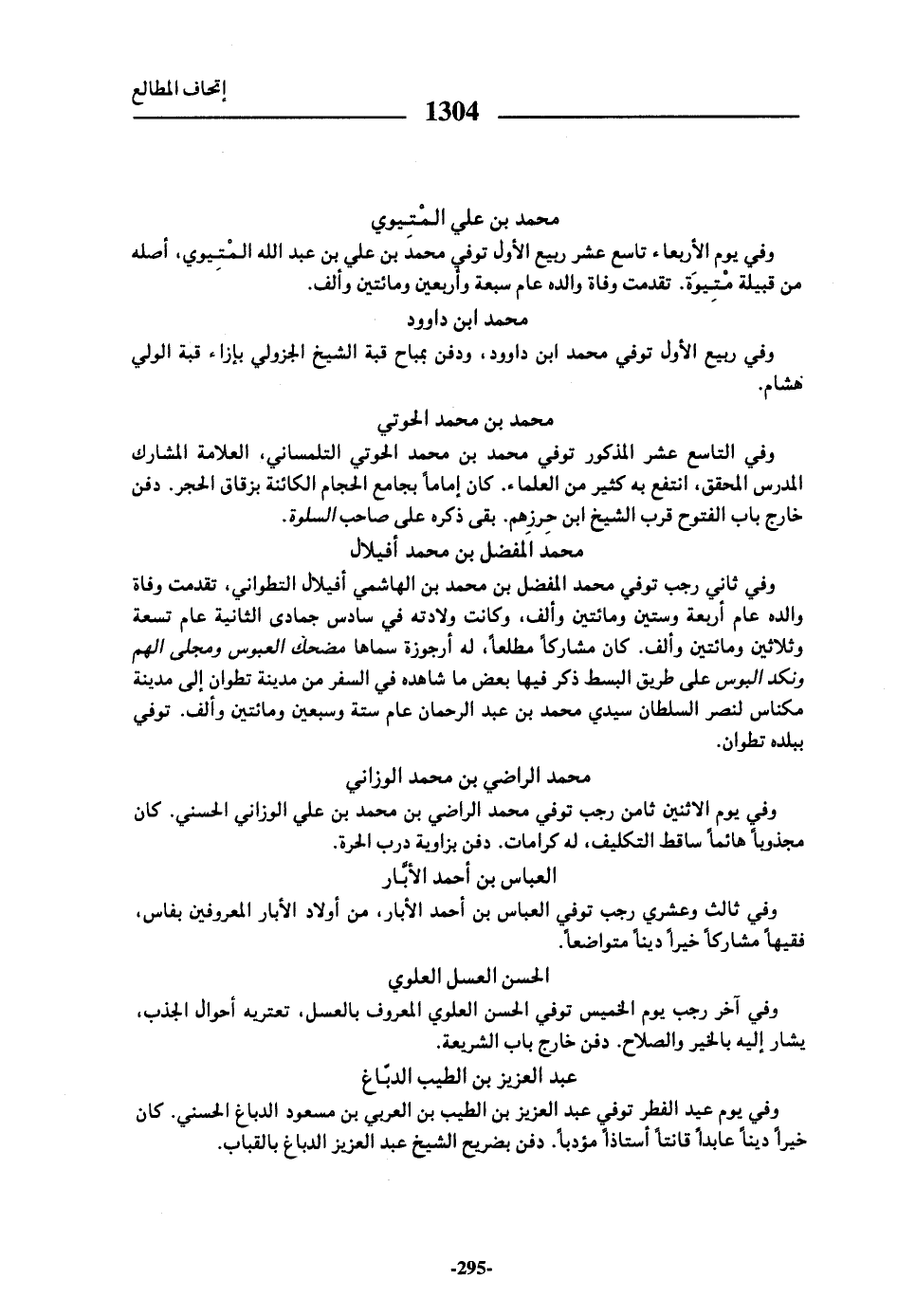 وفي ثاني رجب توفي محمد المفضل بن محمد بن الهاشمي أفيلال التطواني، تقدمت وفاة والده عام أربعة وستين ومائتين وألف، وكانت ولادته في سادس جمادى الثانية عام تسعة وثلاثين ومائتين وألف. كان مشاركا مطلعا، له أرجوزة سماها مضحك العبوس ومجلى الهم ونكد البوس على طريق البسط ذكر فيها بعض ما شاهده في السفر من مدينة تطوان إلى مدينة مكناس لنصر السلطان سيدي محمد بن عبد الرحمان عام ستة وسبعين ومائتين وألف. توفي ببلده تطوان.
