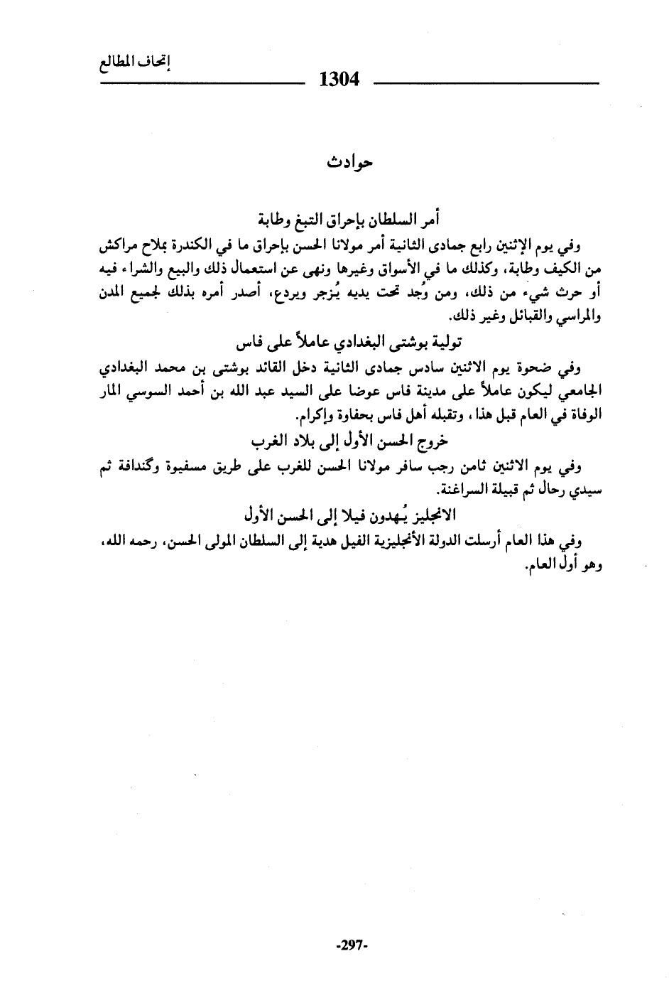 وفي هذا العام أرسلت الدولة الأنجليزية الفيل هدية إلى السلطان المولى الحسن، رحمه الله، وهو أول العام.