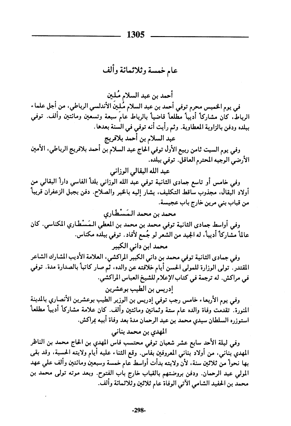 وفي جمادى الثانية توفي محمد بن داني الكبير المراكشي، العلامة الأديب المشارك الشاعر المقتدر. تولى الوزارة للمولى الحسن أيام خلافته عن والده، ثم صار كاتبا بالصدارة مدة. توفي في مراكش. له ترجمة في كتاب الإعلام للشيخ العباس المراكشي.