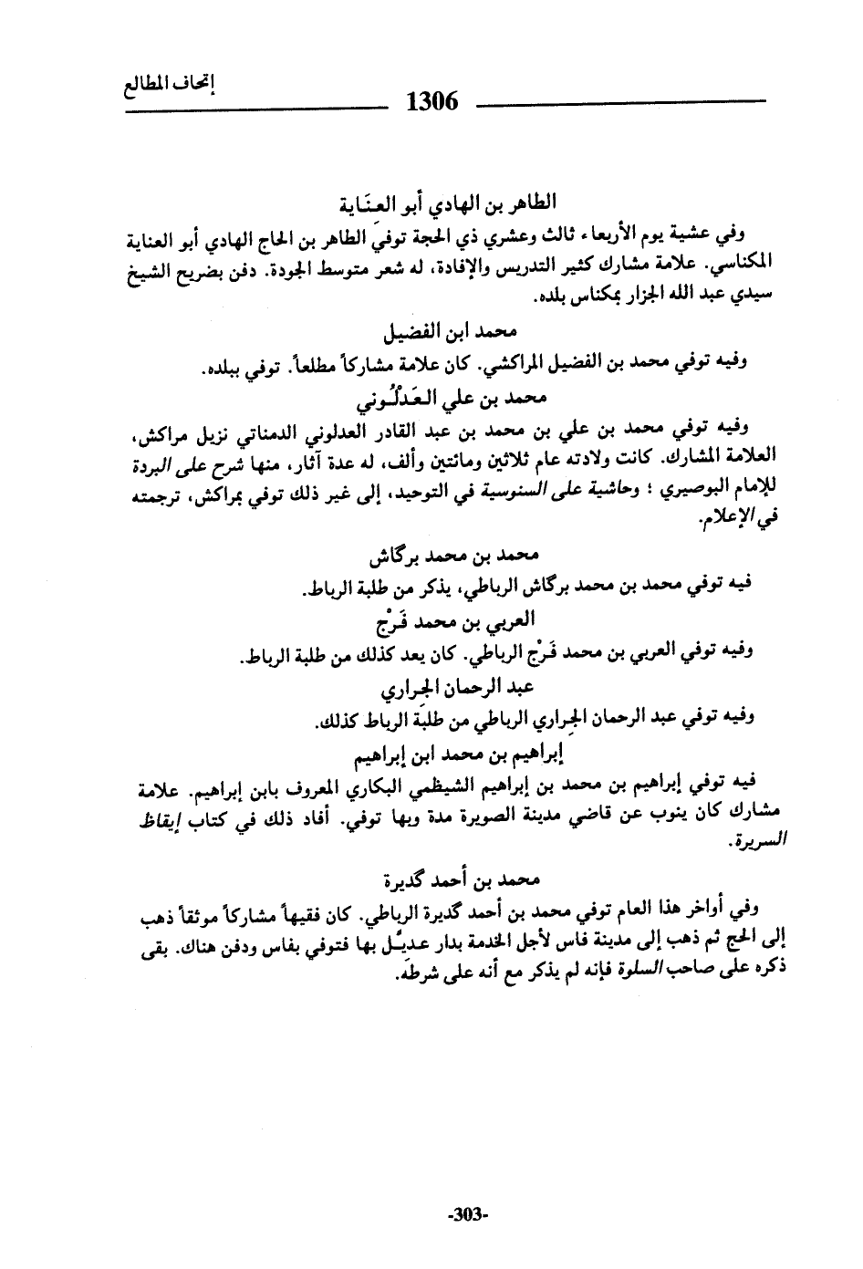 وفي عشية يوم الأربعاء ثالث وعشري ذي الحجة توفي الطاهر بن الحاج الهادي أبو العناية المكناسي. علامة مشارك كثير التدريس والإفادة، له شعر متوسط الجودة. دفن بضريح الشيخ سيدي عبد الله الجزار بمكناس بلده.