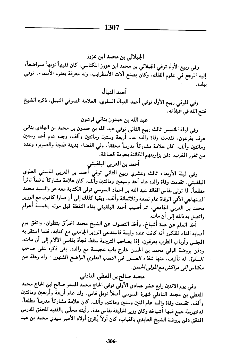 وفي ربيع الأول توفي الجيلالي بن محمد ابن عزوز المكناسي، كان فقيها نزيها متواضعا، إليه المرجع في علوم الفلك، وكان يصنع آلات الأسطرابب، وله معرفة بعلوم الأسماء. توفي ببلده.