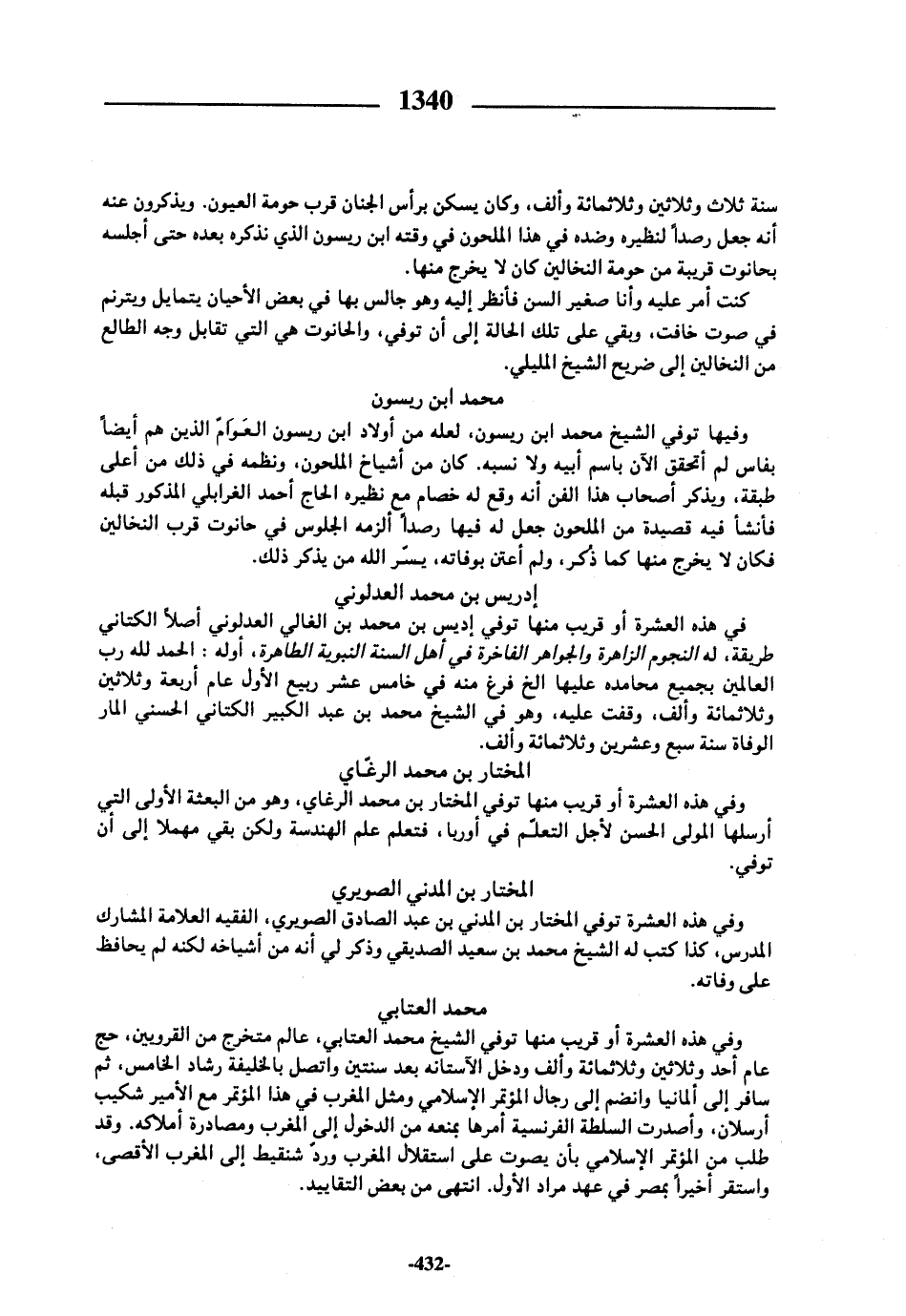 في هذه العشرة أو قريب منها توفي إديس بن محمد بن الغالي العدلوني أصلا الكتاني طريقة، له النجوم الزاهرة والجواهر الفاخرة في أهل السنة النبوية الطاهرة، أوله: الحمد لله رب العالمين بجميع محامده عليها الخ فرغ منه في خامس عشر ربيع الأول عام أربعة وثلاثين وثلاثمائة وألف، وقفت عليه، وهو في الشيخ محمد بن عبد الكبير الكتاني الحسني المار الوفاة سنة سبع وعشرين وثلاثمائة وألف.