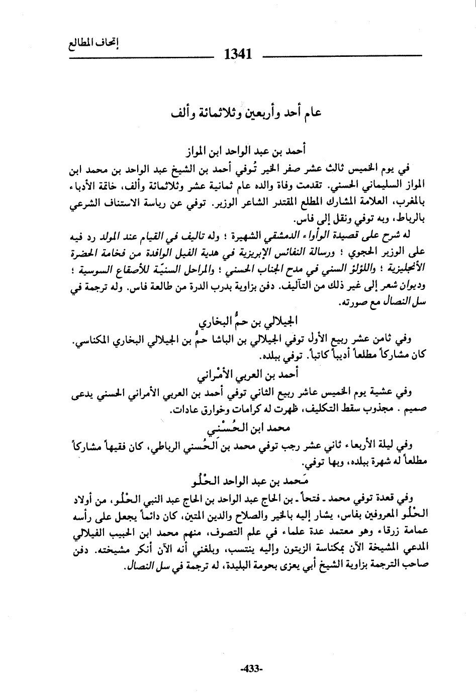 في يوم الخميس ثالث عشر صفر الخير توفي أحمد بن الشيخ عبد الواحد بن محمد ابن المواز السليماني الحسني. تقدمت وفاة والده عام ثمانية عشر وثلاثمائة وألف، خاتمة الأدباء بالمغرب، العلامة المشارك المطلع المقتدر الشاعر الوزير. توفي عن رياسة الاستناف الشرعي بالرباط، وبه توفي ونقل إلى فاس.