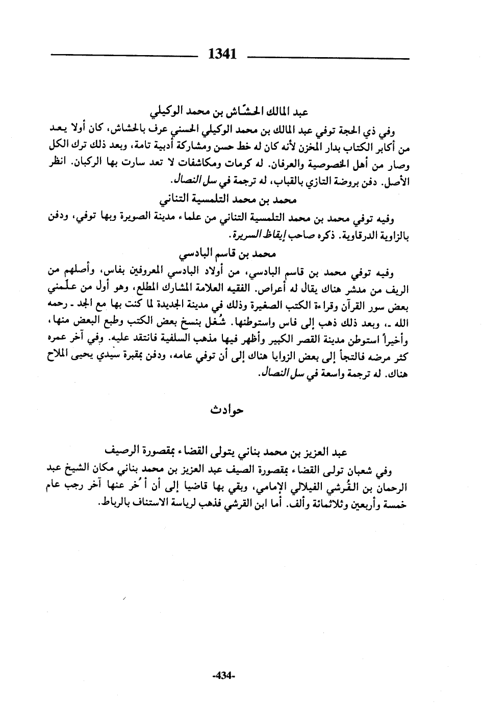 وفي ذي الحجة توفي عبد المالك بن محمد الوكيلي الحسني عرف بالحشاش، كان أولا يعد من أكابر الكتاب بدار المخزن لأنه كان له خط حسن ومشاركة أدبية تامة، وبعد ذلك ترك الكل وصار من أهل الخصوصية والعرفان. له كرمات ومكاشفات لا تعد سارت بها الركبان. انظر الأصل. دفن بروضة التازي بالقباب، له ترجمة في سل النصال.