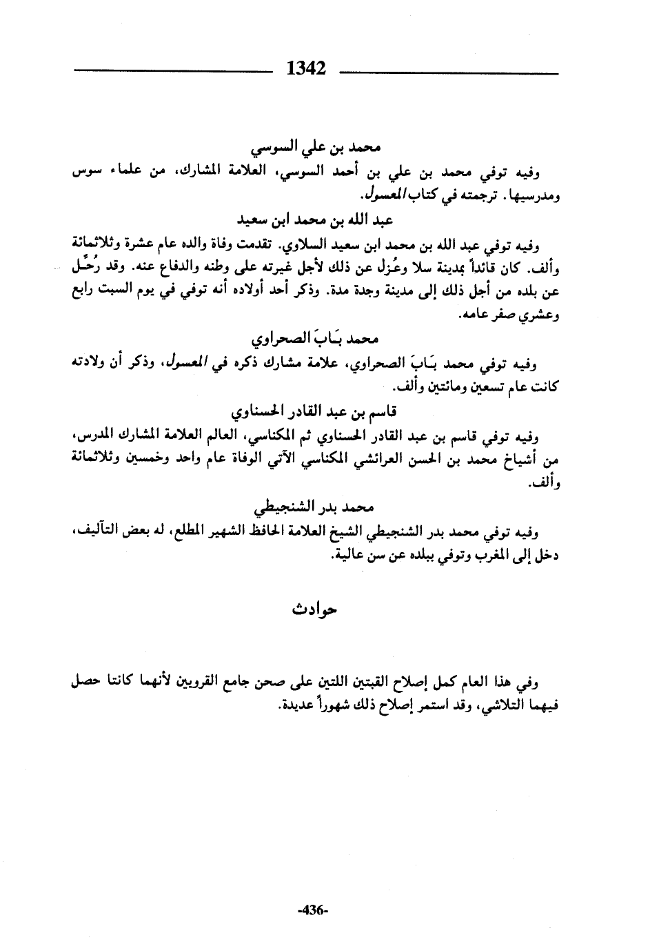 وفيه توفي قاسم بن عبد القادر الحسناوي ثم المكناسي، العالم العلامة المشارك المدرس، من أشياخ محمد بن الحسن العرائشي المكناسي الآتي الوفاة عام واحد وخمسين وثلاثمائة وألف.