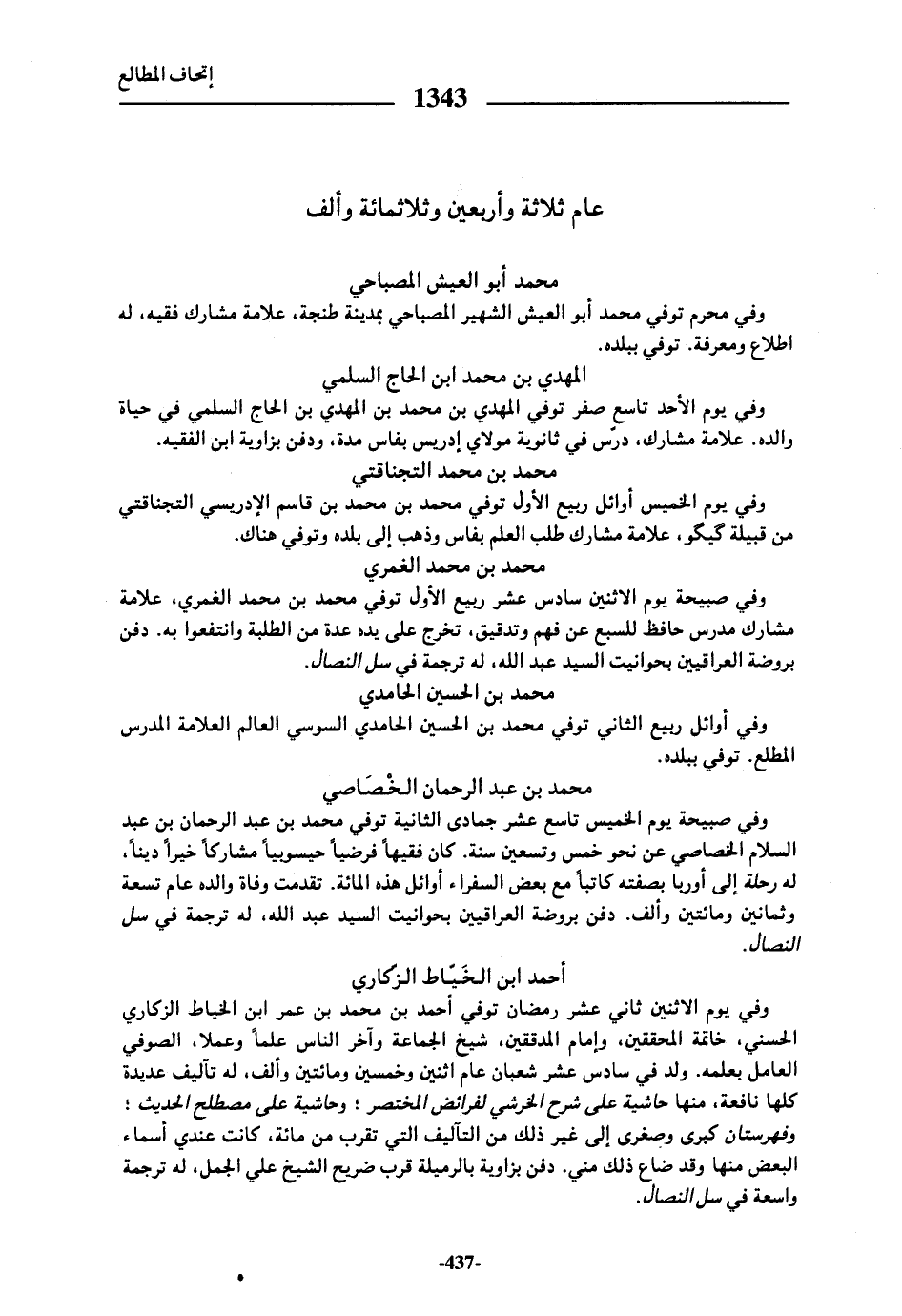 وفي يوم الاثنين ثاني عشر رمضان توفي أحمد بن محمد بن عمر ابن الخياط الزكاري الحسني، خاتمة المحققين، وإمام المدققين، شيخ الجماعة وآخر الناس علما وعملا، الصوفي العامل بعلمه. ولد في سادس عشر شعبان عام اثنين وخمسين ومائتين وألف، له تآليف عديدة كلها نافعة، منها حاشية على شرح الخرشي لفرائض المختصر؛ وحاشية على مصطلح الحديث؛ وفهرستان كبرى وصغرى إلى غير ذلك من التآليف التي تقرب من مائة، كانت عندي أسماء البعض منها وقد ضاع ذلك مني. دفن بزاوية بالرميلة قرب ضريح الشيخ علي الجمل، له ترجمة واسعة في سل النصال.