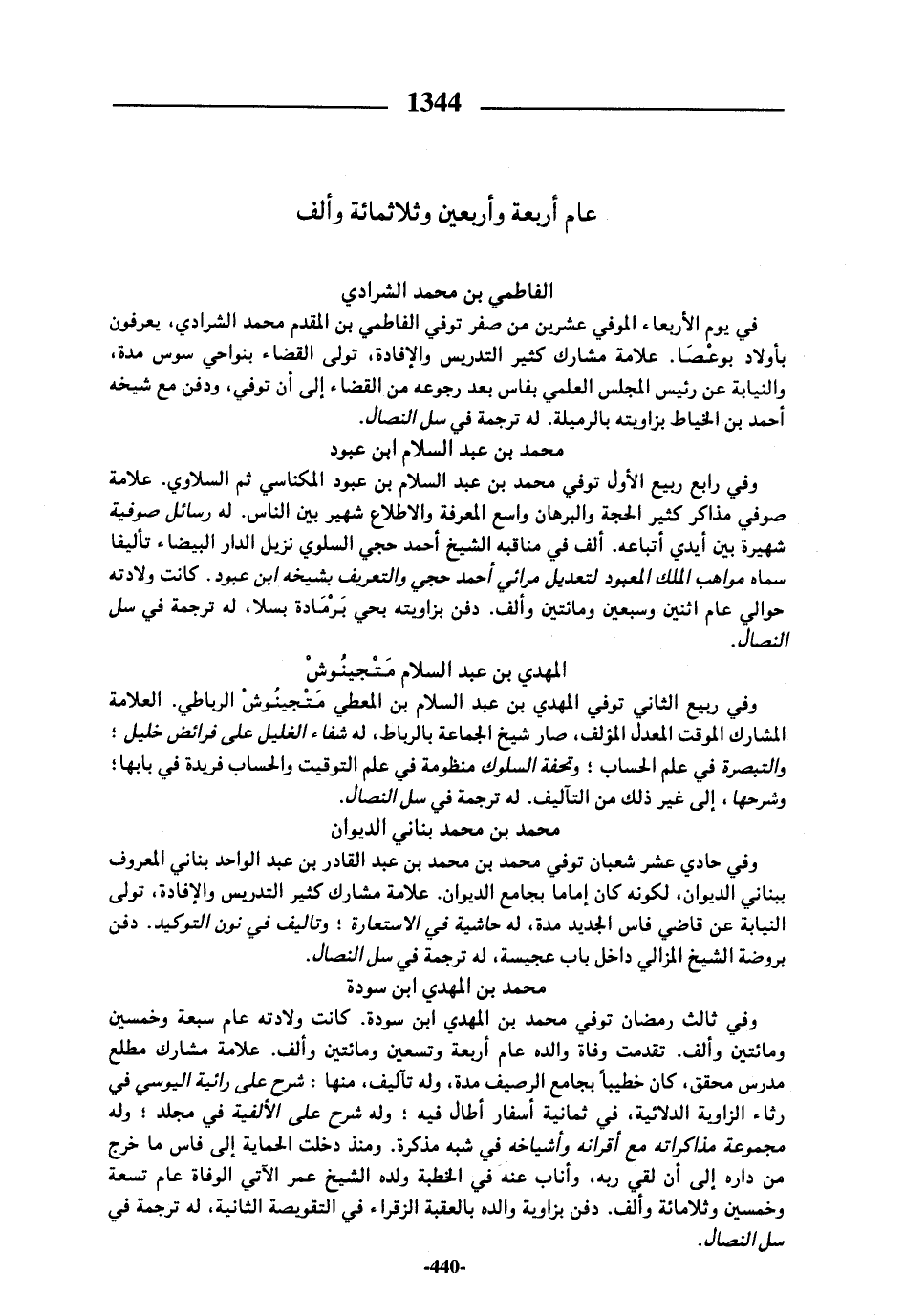 وفي ربيع الثاني توفي المهدي بن عبد السلام بن المعطي متجينوش الرباطي. العلامة المشارك الموقت المعدل المؤلف، صار شيخ الجماعة بالرباط، له شفاء الغليل على فرائض خليل؛ والتبصرة في علم الحساب؛ وتحفة السلوك منظومة في علم التوقيت والحساب فريدة في بابها؛ وشرحها، إلى غير ذلك من التآليف. له ترجمة في سل النصال.