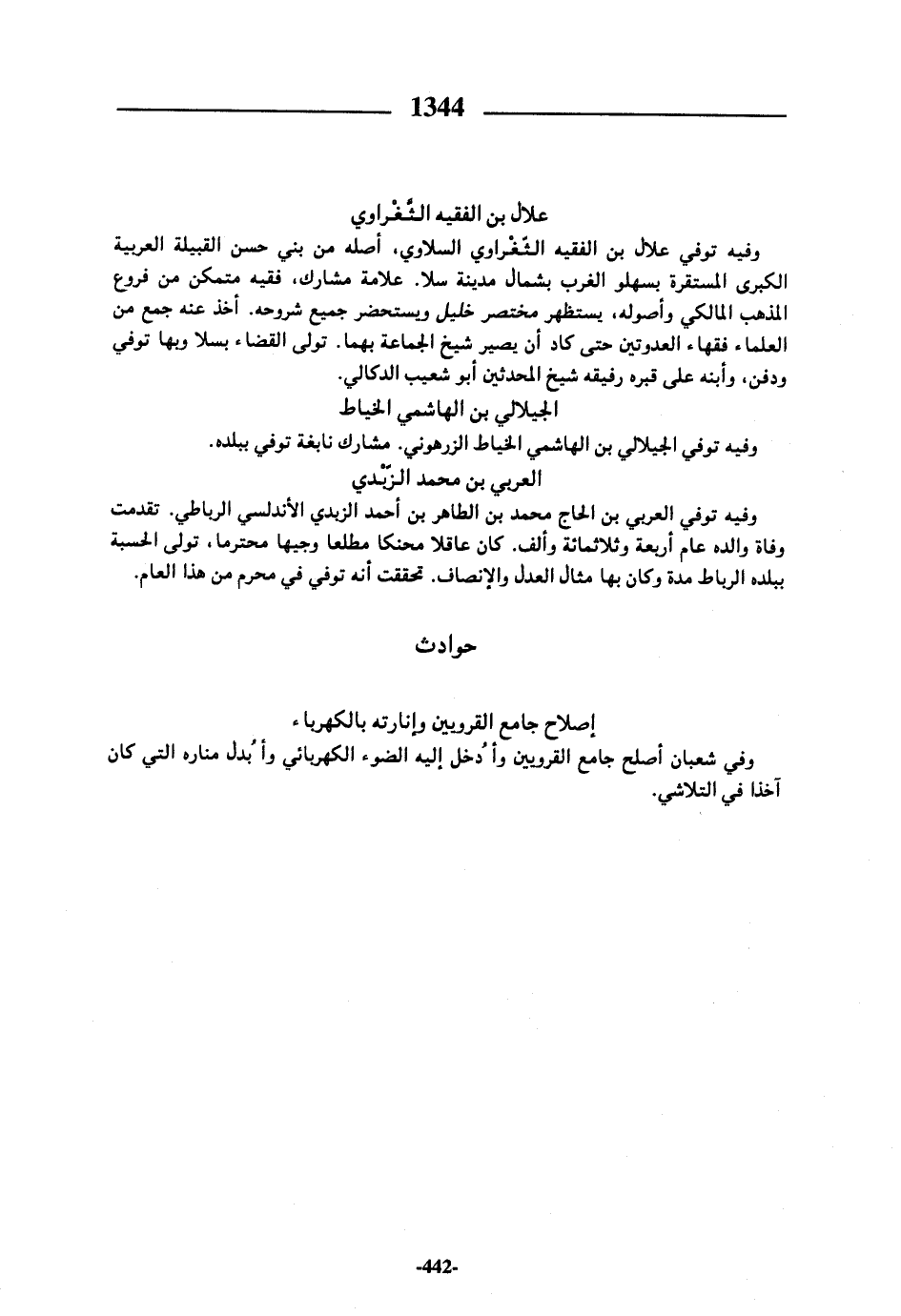 وفي شعبان أصلح جامع القرويين وأدخل إليه الضوء الكهربائي وأبدل مناره التي كان آخذا في التلاشي.