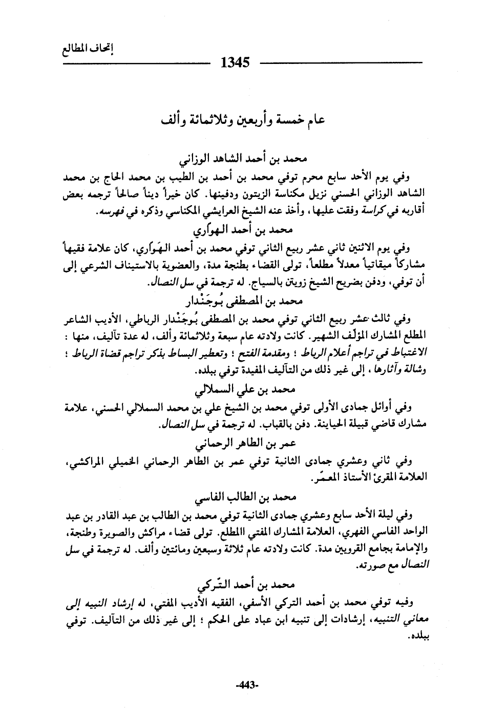وفي ليلة الأحد سابع وعشري جمادى الثانية توفي محمد بن الطالب بن عبد القادر بن عبد الواحد الفاسي الفهري، العلامة المشارك المفتي االمطلع. تولى قضاء مراكش والصويرة وطنجة، والإمامة بجامع القرويين مدة. كانت ولادته عام ثلاثة وسبعين ومائتين وألف. له ترجمة في سل النصال مع صورته.