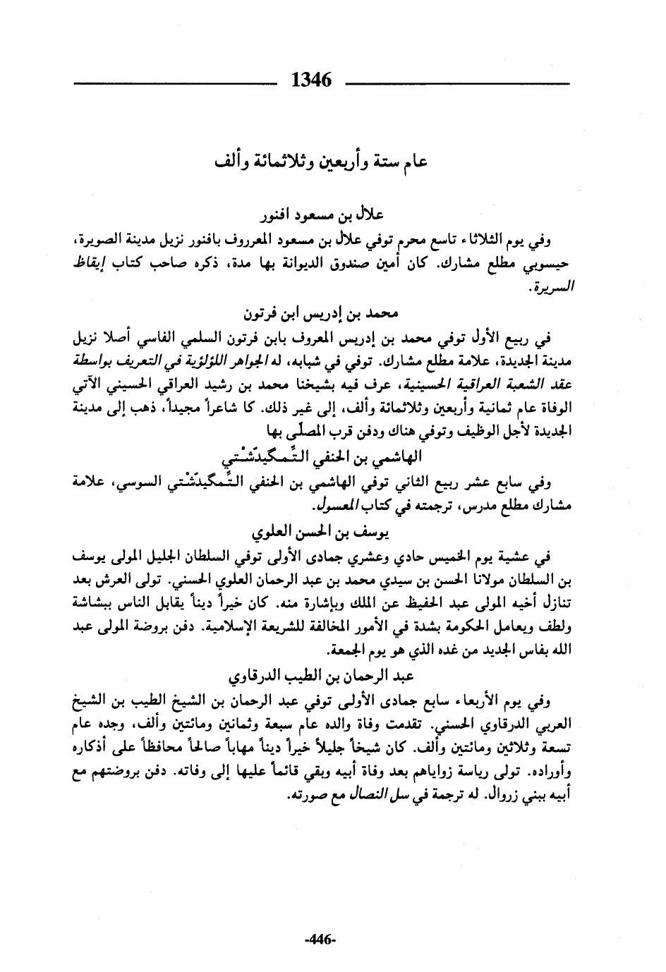 وفي يوم الثلاثاء تاسع محرم توفي علال بن مسعود المعروف بافنور نزيل مدينة الصويرة، حيسوبي مطلع مشارك. كان أمين صندوق الديوانة بها مدة، ذكره صاحب كتاب إيقاظ السريرة.