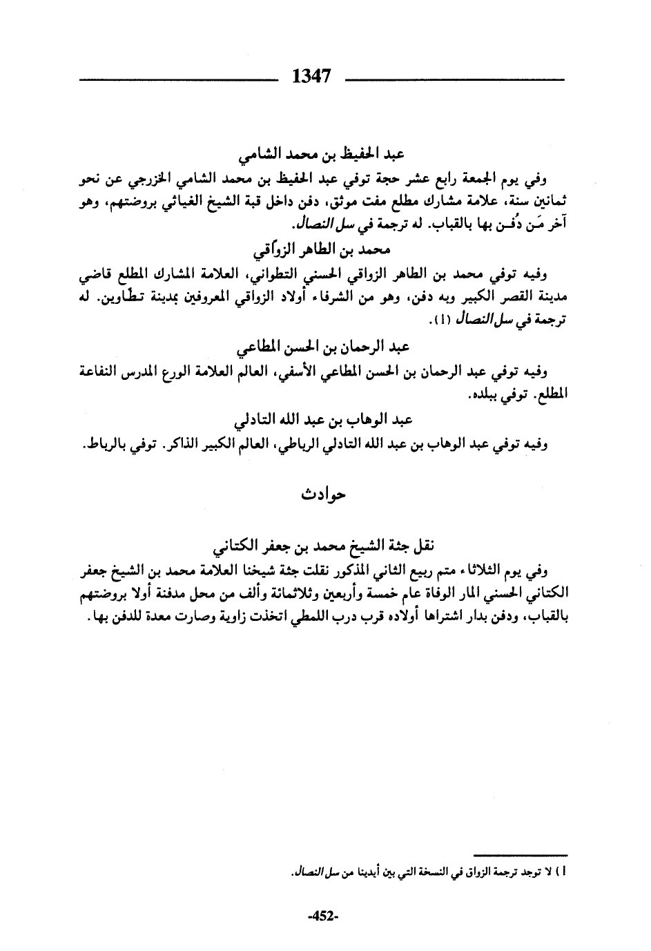 وفيه توفي محمد بن الطاهر الزواقي الحسني التطواني، العلامة المشارك المطلع قاضي مدينة القصر الكبير وبه دفن، وهو من الشرفاء أولاد الزواقي المعروفين بمدينة تطّاوين. له ترجمة في سل النصال (¬1).