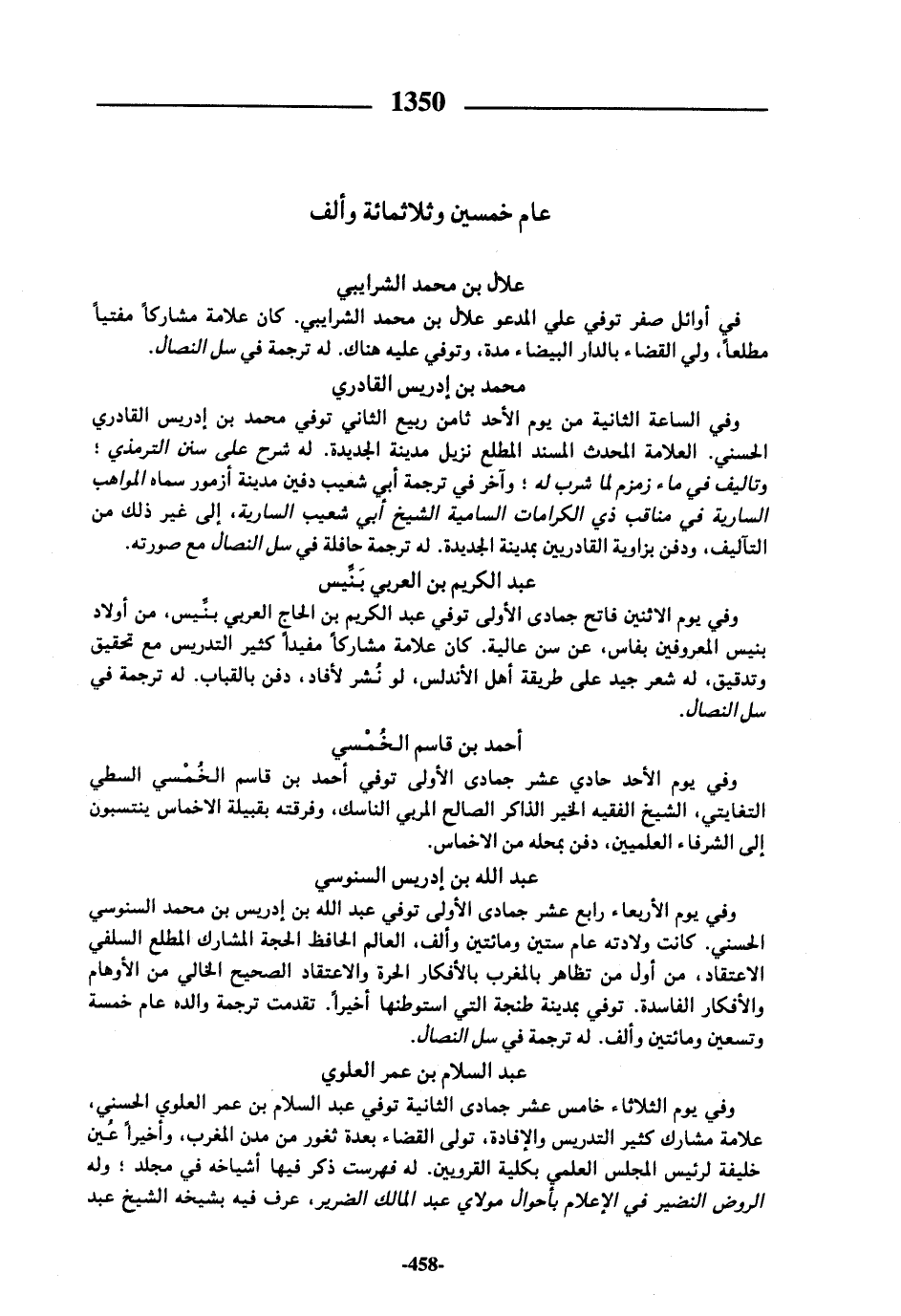 وفي يوم الثلاثاء خامس عشر جمادى الثانية توفي عبد السلام بن عمر العلوي الحسني، علامة مشارك كثير التدريس والإفادة، تولى القضاء بعدة ثغور من مدن المغرب، وأخيرا عين خليفة لرئيس المجلس العلمي بكلية القرويين. له فهرست ذكر فيها أشياخه في مجلد؛ وله الروض النضير في الإعلام بأحوال مولاي عبد المالك الضرير، عرف فيه بشيخه الشيخ عبد
