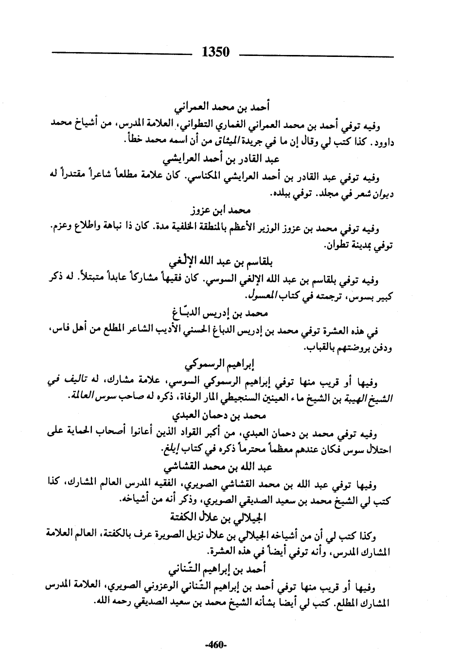 وفيها أو قريب منها توفي أحمد بن إبراهيم التّناني الوعزوني الصويري، العلامة المدرس المشارك المطلع. كتب لي أيضا بشأنه الشيخ محمد بن سعيد الصديقي رحمه الله.