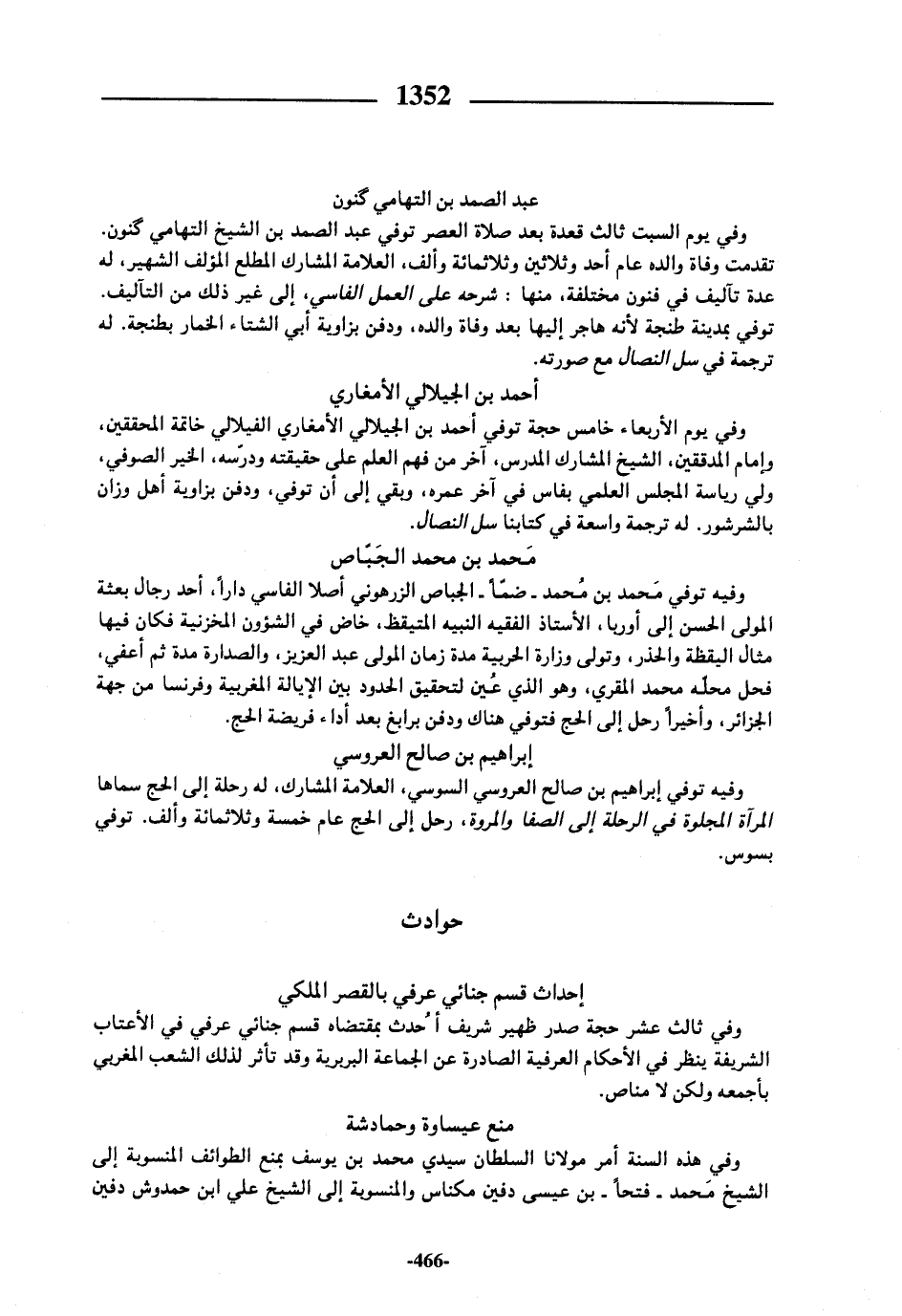 وفيه توفي إبراهيم بن صالح العروسي السوسي، العلامة المشارك، له رحلة إلى الحج سماها المرآة المجلوة في الرحلة إلى الصفا والمروة، رحل إلى الحج عام خمسة وثلاثمائة وألف. توفي بسوس.