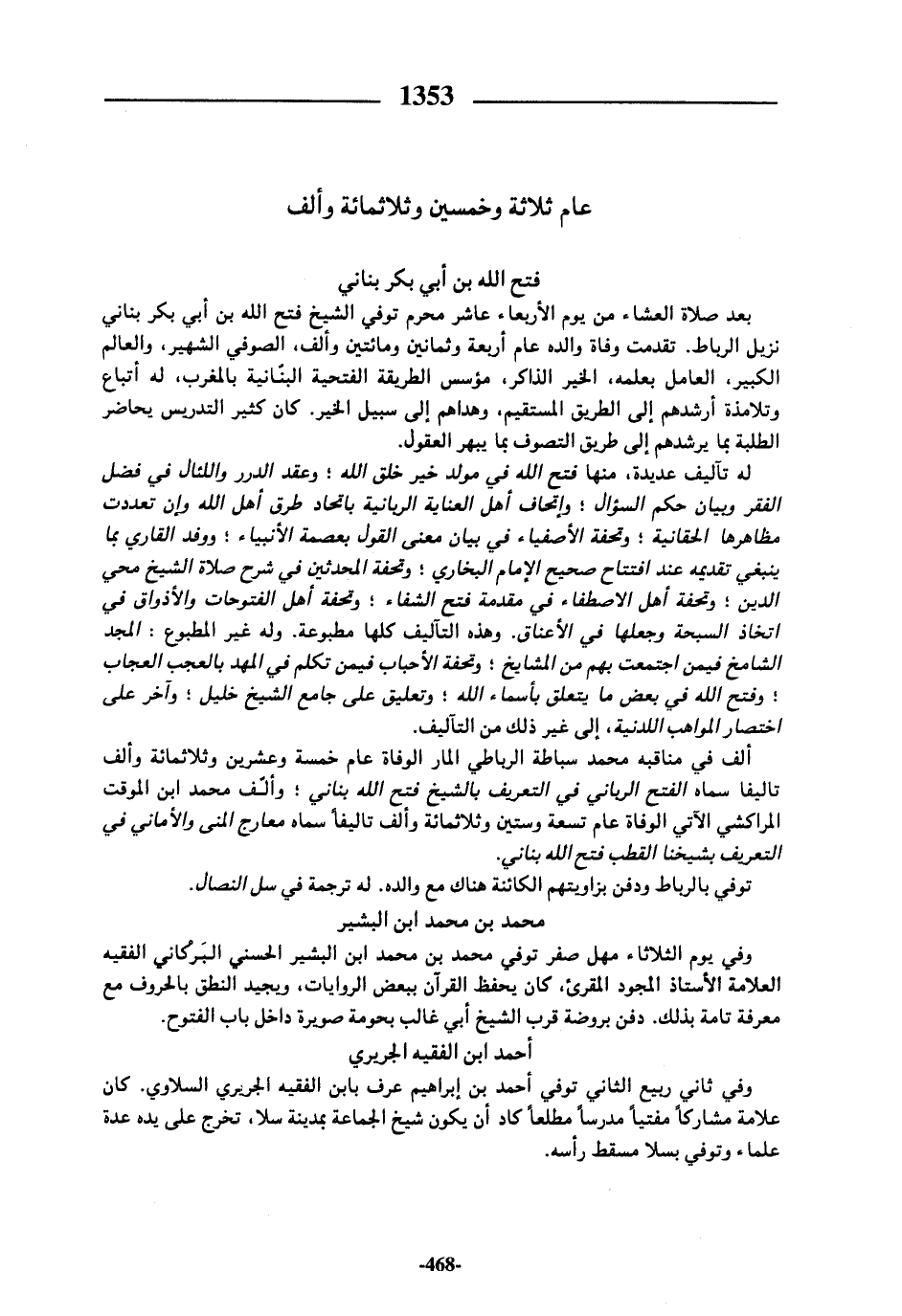 بعد صلاة العشاء من يوم الأربعاء عاشر محرم توفي الشيخ فتح الله بن أبي بكر بناني نزيل الرباط. تقدمت وفاة والده عام أربعة وثمانين ومائتين وألف، الصوفي الشهير، والعالم الكبير، العامل بعلمه، الخير الذاكر، مؤسس الطريقة الفتحية البنّانية بالمغرب، له أتباع وتلامذة أرشدهم إلى الطريق المستقيم، وهداهم إلى سبيل الخير. كان كثير التدريس يحاضر الطلبة بما يرشدهم إلى طريق التصوف بما يبهر العقول.