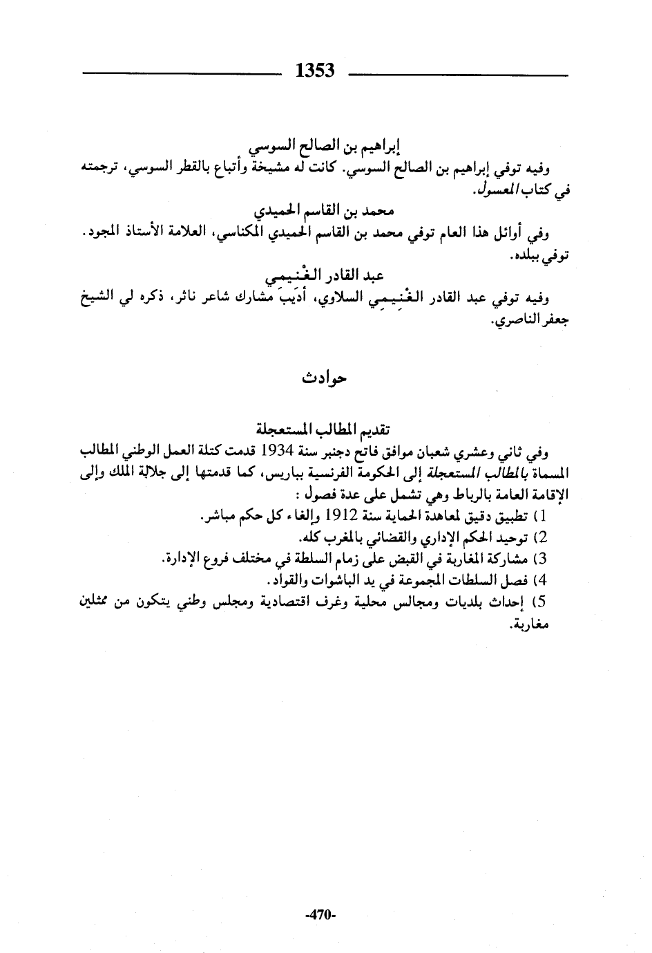 وفي ثاني وعشري شعبان موافق فاتح دجنبر سنة 1934 قدمت كتلة العمل الوطني المطالب المسماة بالمطالب المستعجلة إلى الحكومة الفرنسية بباريس، كما قدمتها إلى جلالة الملك وإلى الإقامة العامة بالرباط وهي تشمل على عدة فصول: