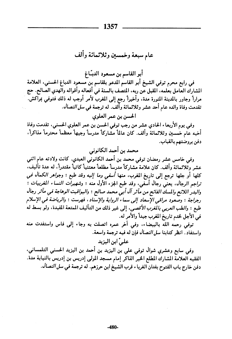 في رابع محرم توفي الشيخ أبو القاسم المدعو بلقاسم بن مسعود الدباغ الحسني، العلامة المشارك العامل بعلمه، المقبل عن ربه، المتصف بالسنة في أفعاله وأقواله والهدي الصالح. حج مرارا وجاور بالمدينة المنورة مدة، وأخيرا رجع إلى المغرب لأمر أوجب له ذلك فتوفي بمراكش.