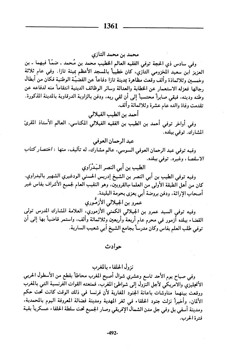 وفي سادس ذي الحجة توفي الفقيه العالم الخطيب محمد بن محمد-ضمّا فيهما-بن العزيز ابن سعيد المخزومي التازي، كان خطيبا بالمسجد الأعظم بمينة تازا. وفي عام ثلاثة وخمسين وثلاثماذة وألف وقعت مظاهرة بمدينة تازا دفاعا عن القضيّة الوطنية فكان من أبطال رجالها فعزله الاستعمار عن الخطابة والعدالة وسائر الوظائف الدينية انتقاما منه لدفاعه عن وطنه ودينه، فبقي صابرا محتسبا إلى أن لقي ربه، ودفن بالزاوية الدرقاوية بالمدينة المذكورة.