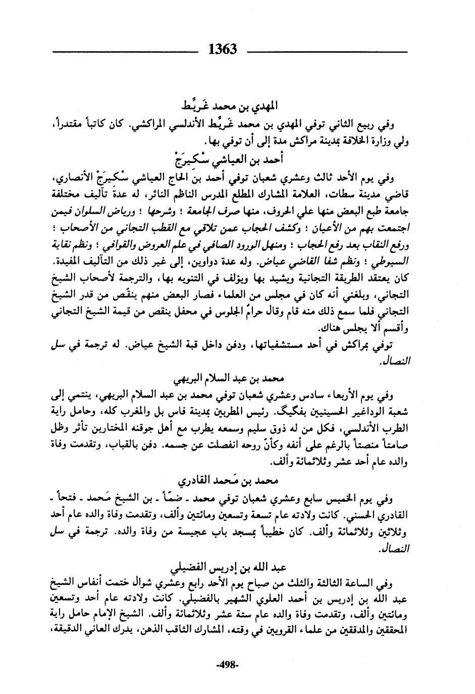 وفي الساعة الثالثة والثلث من صباح يوم الأحد رابع وعشري شوال ختمت أنفاس الشيخ عبد الله بن إدريس بن أحمد العلوي الشهير بالفضيلي. كانت ولادته عام أحد وتسعين ومائتين وألف، وتقدمت وفاة والده عام ستة عشر وثلاثمائة وألف. الشيخ الإمام حامل راية المحققين والمدققين من علماء القرويين في وقته، المشارك الثاقب الذهن، يدرك العاني الدقيقة،