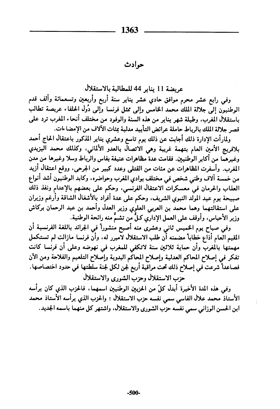 وفي رابع عشر محرم موافق حادي عشر يناير سنة أربع وأربعين وتسعمائة وألف قدم الوطنيون إلى جلالة الملك محمد الخامس وإلى ممثل فرنسا وإلى دول الحلفاء عريصة تطالب باستقلال المغرب، وطيلة شهر يناير من هذه السنة والوفود من مختلف أنحاء المغرب ترد على قصر جلالة الملك بالرباط حاملة عرائض التأييد مدلية بمئات الآلاف من الإمضاءات.