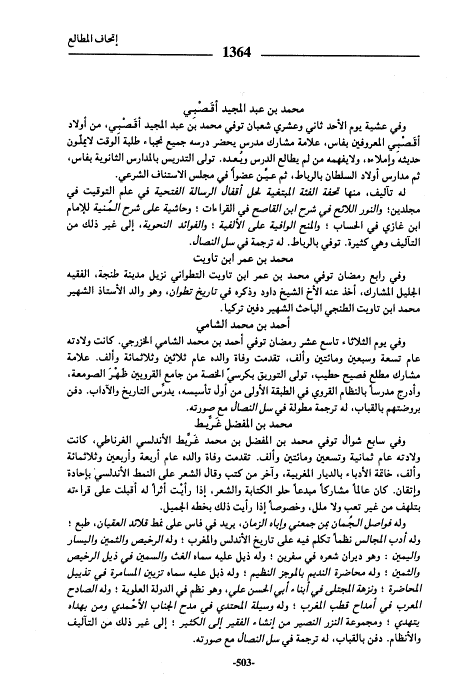 وفي عشية يوم الأحد ثاني وعشري شعبان توفي محمد بن عبد المجيد أقصبي، من أولاد أقصبي المعروفين بفاس، علامة مشارك مدرس يحضر درسه جميع نجباء طلبة الوقت لا يملّون حديثه وإملاءه، ولا يفهمه من لم يطالع الدرس ويعده. تولى التدريس بالمدارس الثانوية بفاس، ثم مدارس أولاد السلطان بالرباط، ثم عيّن عضوا في مجلس الاستناف الشرعي.