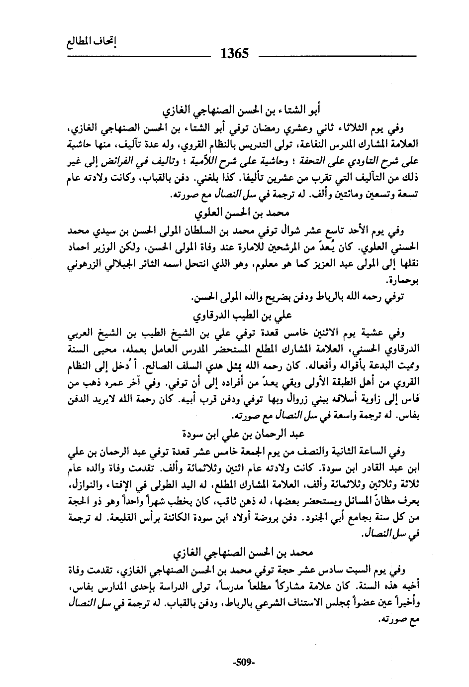 وفي يوم السبت سادس عشر حجة توفي محمد بن الحسن الصنهاجي الغازي، تقدمت وفاة أخيه هذه السنة. كان علامة مشاركا مطلعا مدرسا، تولى الدراسة بإحدى المدارس بفاس، وأخيرا عين عضوا بمجلس الاستناف الشرعي بالرباط، ودفن بالقباب. له ترجمة في سل النصال مع صورته.