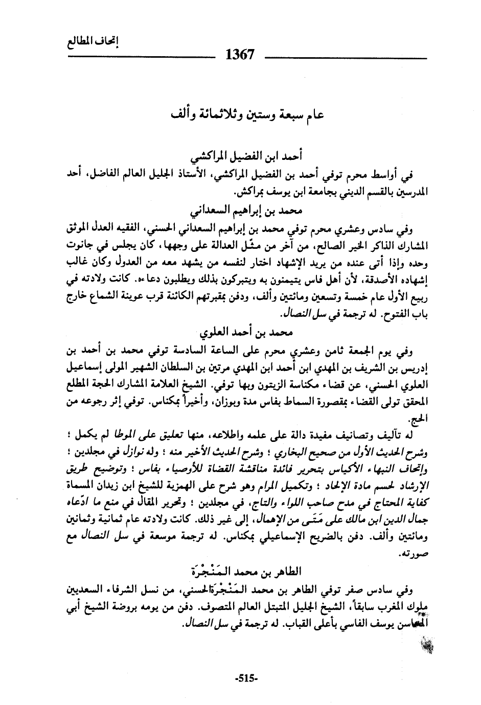 وفي يوم الجمعة ثامن وعشري محرم على الساعة السادسة توفي محمد بن أحمد بن إدريس بن الشريف بن المهدي ابن أحمد ابن المهدي مرتين بن السلطان الشهير المولى إسماعيل العلوي الحسني، عن قضاء مكناسة الزيتون وبها توفي. الشيخ العلامة المشارك الحجة المطلع المحقق تولى القضاء بمقصورة السماط بفاس مدة وبوزان، وأخيرا بمكناس. توفي إثر رجوعه من الحج.