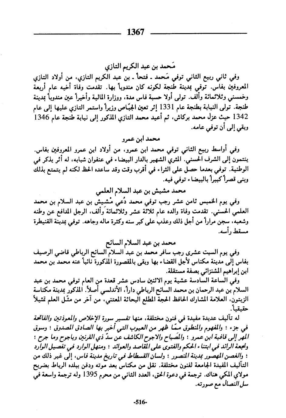 وفي الساعة السادسة عشية يوم الاثنين سادس عشر قعدة من العام توفي محمد بن عبد السلام بن عبد الرحمان بن محمد السائح الرباطي دارا، الأندلسي أصلا. المذكور بمدينة مكناسة الزيتون، العلامة المشارك الحافظ الحجة المطلع البحاثة المعتني، من آخر من مثّل العلم تمثيلا حقيقيا.