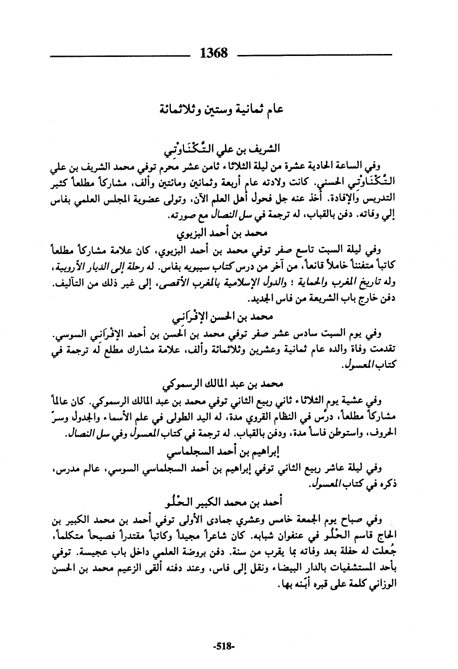 وفي الساعة الحادية عشرة من ليلة الثلاثاء ثامن عشر محرم توفي محمد الشريف بن علي التّكناوتي الحسني. كانت ولادته عام أربعة وثمانين ومائتين وألف، مشاركا مطلعا كثير التدريس والإفادة. أخذ عنه جل فحول أهل العلم الآن، وتولى عضوية المجلس العلمي بفاس إلي وفاته. دفن بالقباب، له ترجمة في سل النصال مع صورته.