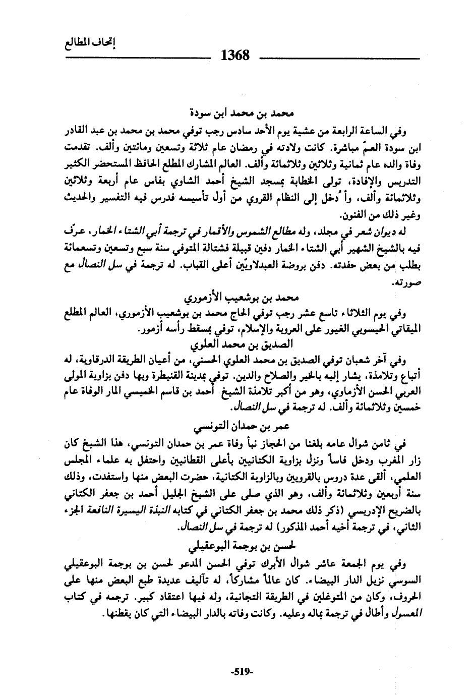 وفي الساعة الرابعة من عشية يوم الأحد سادس رجب توفي محمد بن محمد بن عبد القادر ابن سودة العمّ مباشرة. كانت ولادته في رمضان عام ثلاثة وتسعين ومائتين وألف. تقدمت وفاة والده عام ثمانية وثلاثين وثلاثمائة وألف. العالم المشارك المطلع الحافظ المستحضر الكثير التدريس والإفادة، تولى الخطابة بمسجد الشيخ أحمد الشاوي بفاس عام أربعة وثلاثين وثلاثمائة وألف، وأدخل إلى النظام القروي من أول تأسيسه فدرس فيه التفسير والحديث وغير ذلك من الفنون.