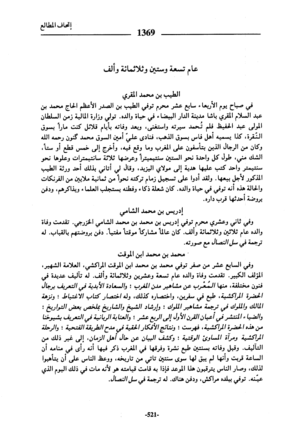 وفي السابع عشر من صفر توفي محمد بن محمد ابن الموقت المراكشي، العلامة الشهير، المؤلف الكبير. تقدمت وفاة والده عام تسعة وعشرين وثلاثمائة وألف. له تآليف عديدة في فنون مختلفة، منها المعرب عن مشاهير مدن المغرب؛ والسعادة الأبدية في التعريف برجال الحضرة المراكشية، طبع في سفرين، واختصاره كذلك، وله اختصار كتاب الاغتباط؛ ونزهة المالك والملوك في ترجمة مشاهير الملوك؛ وإرشاد الشيخ والشاريخ بملخص بعض التواريخ؛ والضياء المنتشر في أعيان القرن الأول إلى الربع عشر؛ والعناية الربانية في التعريف بشيوخنا من هذه الحضرة المراكشية، فهرست؛ ونتائج الأفكار الحقية في مدح الطريقة الفتحية؛ والرحلة المراكشية ومرآة المساوئ الوقتية؛ وكشف البيان عن حال أهل الزمان، إلى غير ذلك من التآليف. وقبل وفاته بسنتين طبع نشرة وفرقها في المغرب ذكر فيها أنه رأى في منامه أن الساعة قربت وأنها لم يبق لها سوى سنتين تاتي من تاريخه، ووعظ الناس على أن يتأهبوا لذلك، وصار الناس يترقبون هذا الموعد فإذا به قامت قيامته هو لأنه مات في ذلك اليوم الذي عيّنه. توفي ببلده مراكش، ودفن هناك. له ترجمة في سل النصال.