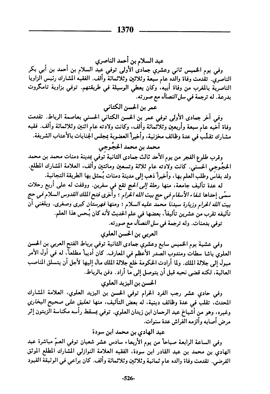 وفي يوم الخميس ثاني وعشري جمادى الأولى توفي عبد السلام بن أحمد بن أبي بكر الناصري. تقدمت وفاة والده عام سبعة وثلاثين وثلاثمائة وألف. الفقيه المشارك رئيس الزاويا الناصرية بالمغرب من وفاة أبيه، وكان يعطي الوسيلة في طريقتهم. توفي بزاوية تامكروت بدرعة. له ترجمة في سل النصال مع صورته.