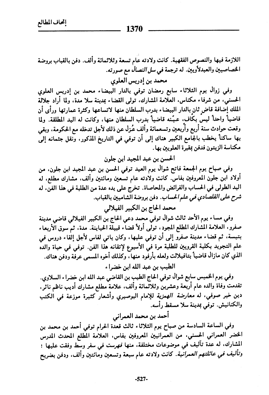 اللازمة فيها والنصوص الفقهية. كانت ولادته عام تسعة وثلاثمائة وألف. دفن بالقباب بروضة الخصاصيين والعبدلاّويين. له ترجمة في سل النصال مع صورته.