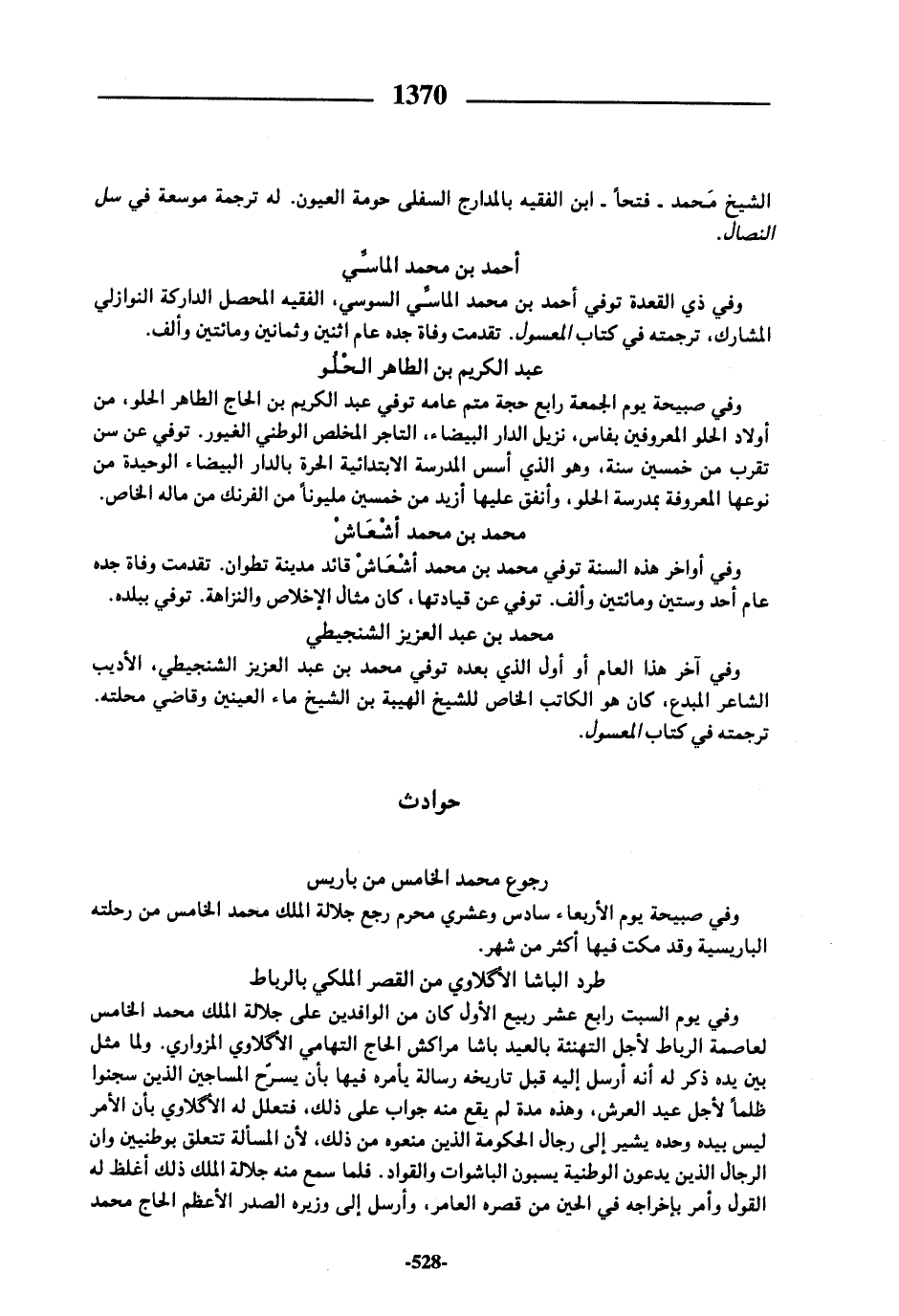 وفي ذي القعدة توفي أحمد بن محمد الماسّي السوسي، الفقيه المحصل الداركة النوازلي المشارك، ترجمته في كتاب المعسول. تقدمت وفاة جده عام اثنين وثمانين ومائتين وألف.