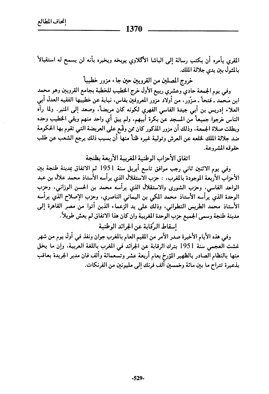 وفي هذه الأيام الأخيرة صدر الأمر من المقيم العام بالمغرب جوان ونفذ في أول يوم من شهر غشت العجمي سنة 1951 بترك الرقابة عن الجرائد في المغرب باللغة العربية، وإن ما يخل منها بالنظام الصادر بالظهير المؤرخ بعام أربعة عشر وتسعمائة وألف فان مدير الجريدة يعاقب بذعيرة تتراح ما بين مائة وخمسين ألف فرنك إلى مليونين من الفرنكات.